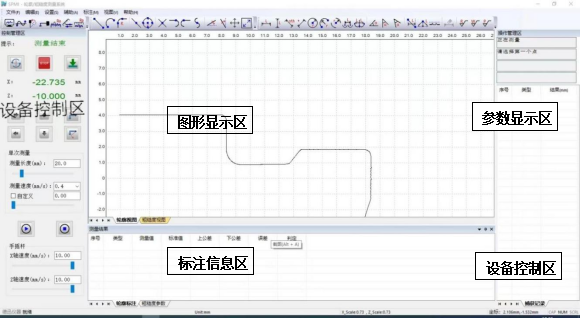系統(tǒng)界面主要包括:菜單、工具欄、狀態(tài)欄、圖形顯示區(qū)(輪廓及粗糙度視圖)、標(biāo)注信息區(qū)(輪廓標(biāo)注及粗糙度參數(shù)列表)、系統(tǒng)參數(shù)顯示區(qū)、設(shè)備控制區(qū)。